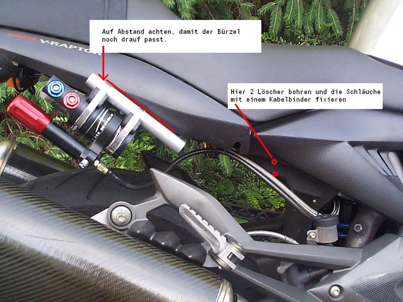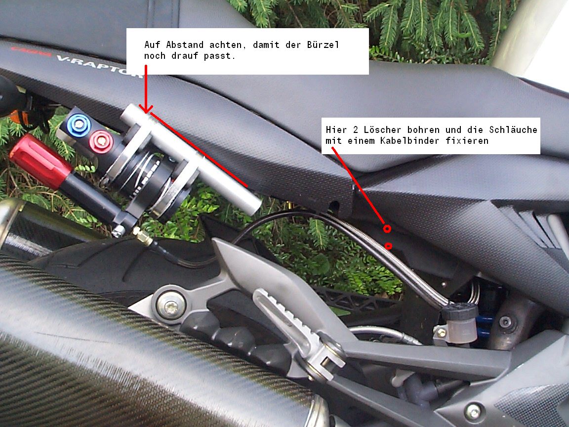 Vor dem Einbau des Federbeins den Schlauch zum Ausgleichsbehälter unbedingt in Längsrichtung mit Tesa Krepp o.ä. bekleben, sonst gibts überall Kratzer!! (Klebe in Längsrichtung geht leichter wieder runter) Viele Grüsse Sigi Klick auf die Fotos um eine größere Ansicht zu bekommen: (mit dem "Zurück-Button in der Navigationsleiste im Browser gehts zurück.) AA AA![]() Hier sind die Bilder 1 und 3 noch mal in größerer Auflösung: Bild 1 (155kb)AABild 2 (197kb)