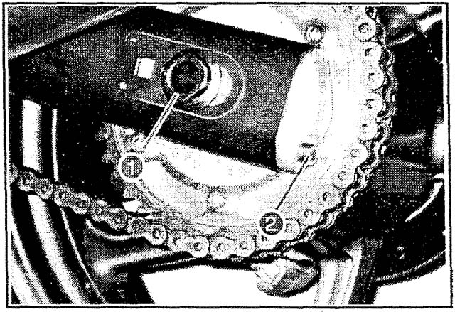 - Die beiden Einstellvorrichtungen der Kette soweit festziehen oder lösen, bis der Kettendurchhang auf halben Weg zwischen Ritzel und Zahnkranz 25 - 25 - 35 mm beträgt. Die Markierung A (übernächstes Bild) an beiden Einstellvorrichtungen muß sich in der gleichen Skalenposition befinden, damit die beiden Räder richtig aufeinander ausgerichtet sind.