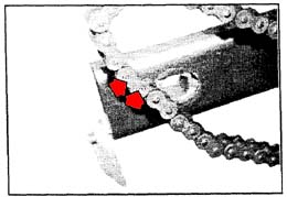 Durch Sichtkontrolle die Kette auf die nachstehenden Defekte überprüfen. (Das Motorrad aufbocken und mit einem Holzblock unterstützen. Das Hinterrad im Leerlauf langsam von Hand drehen.)