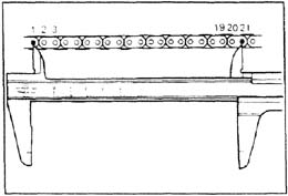 - 21 Kettenbolzen abzählen und den Abstand zwischen den beiden Endpunkten messen. Ist der gemessene Wert höher als der Grenzwert von 323 mm (20 Kettenglieder), muß die Kette ausgetauscht werden.