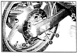 - Den Kettenspanner 2 lösen, anschließend die Radachsmutter 1 abschrauben und die Radachse 3 zur gegenüber liegenden Seite herausziehen.