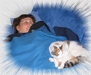 Auf dem Bild ist deutlich zu erkennen, dass unsere Katze absolut nicht mit der Belagerung des ansonsten nur für Sie bereitstehenden kuscheligen Schlafplatzes einverstanden ist.